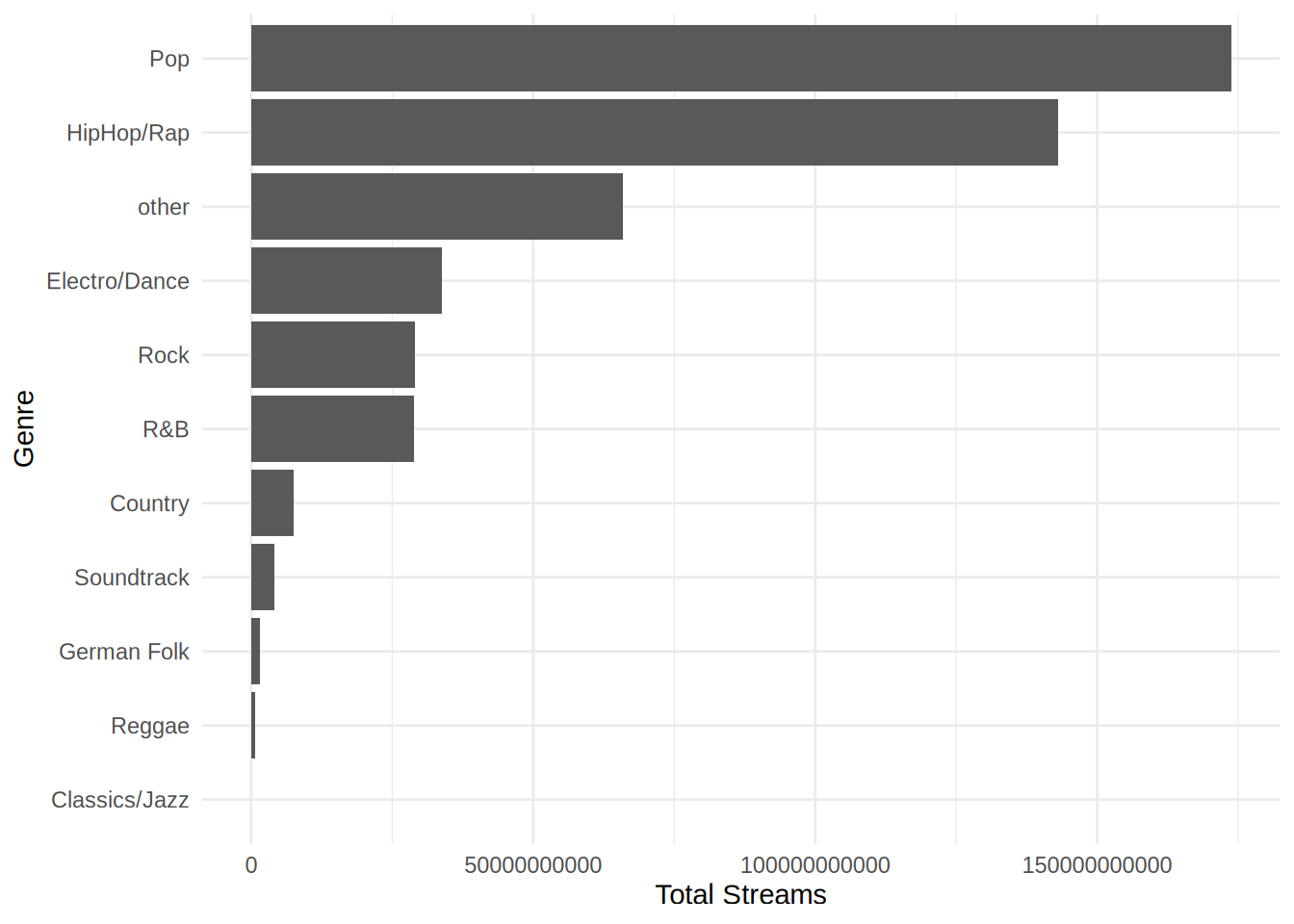 - Create a bar plot in which the heights of the bars correspond to the total number of streams within a genre (Bonus: order the bars by their height)