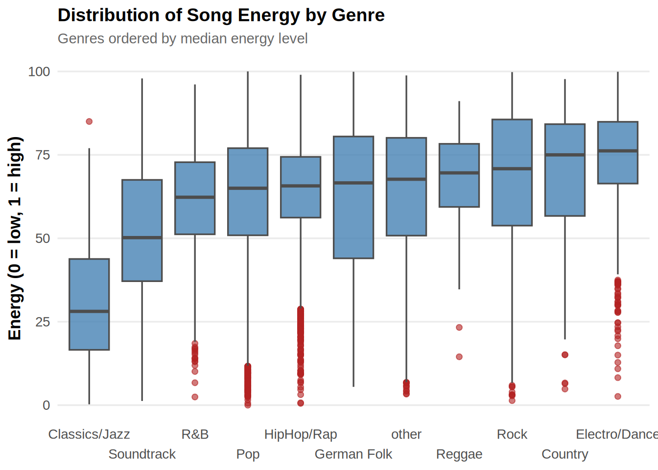 outlier.alpha = 0.6) + labs(title = "Distribution of Song Energy by Genre",