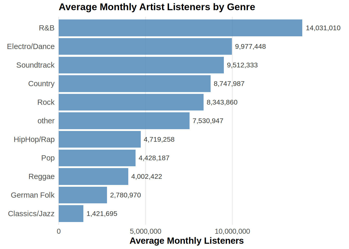 x = "Average Monthly Listeners", y = NULL) + theme_minimal(base_size = 13) +