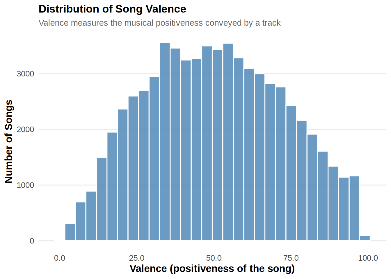 labs(title = "Distribution of Song Valence", subtitle = "Valence measures the musical positiveness conveyed by a track",