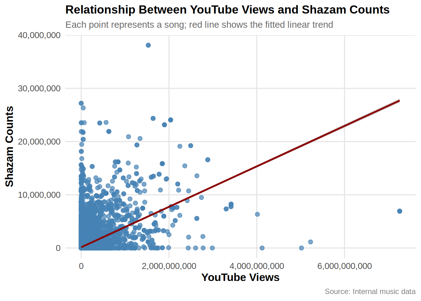 ggplot(music_data, aes(x = youtube_views, y = shazam_counts)) +