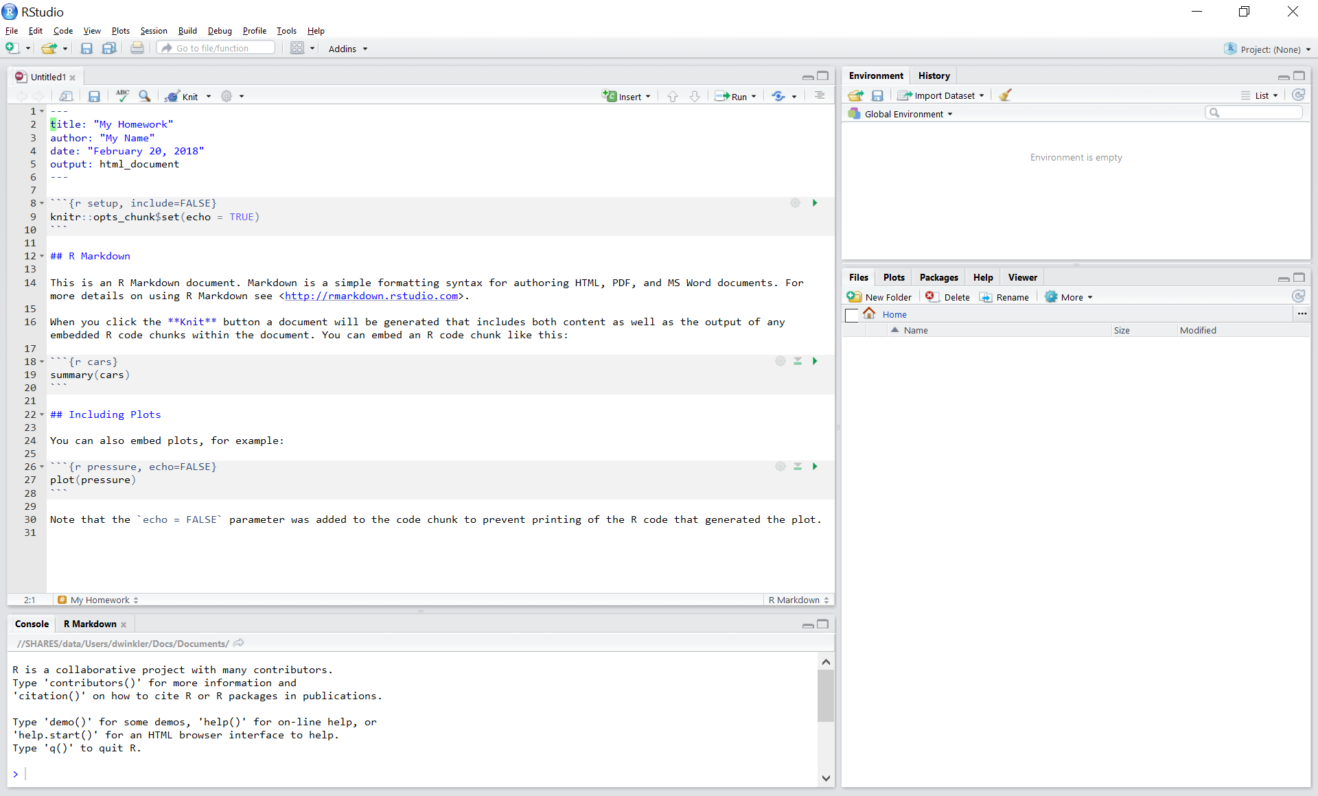 This page will guide you through creating and editing R Markdown documents. This is a useful tool for reporting your analysis (e.g. for homework assignments). Of course, there is also a cheat sheet for R-Markdown and this book contains a comprehensive discussion of the format.