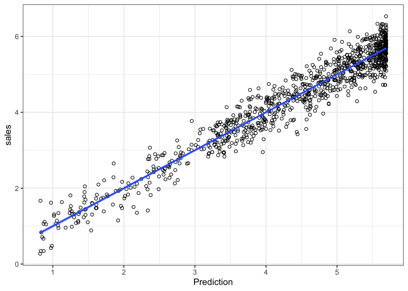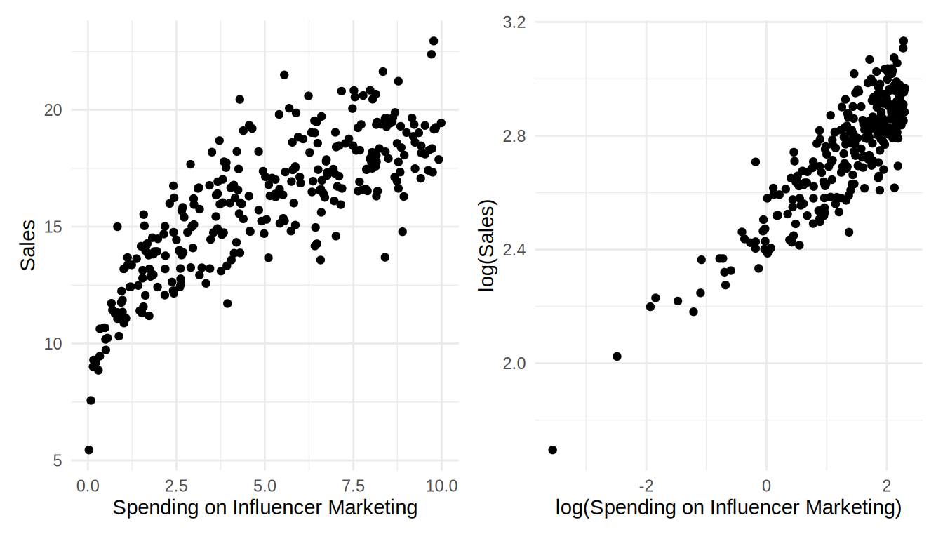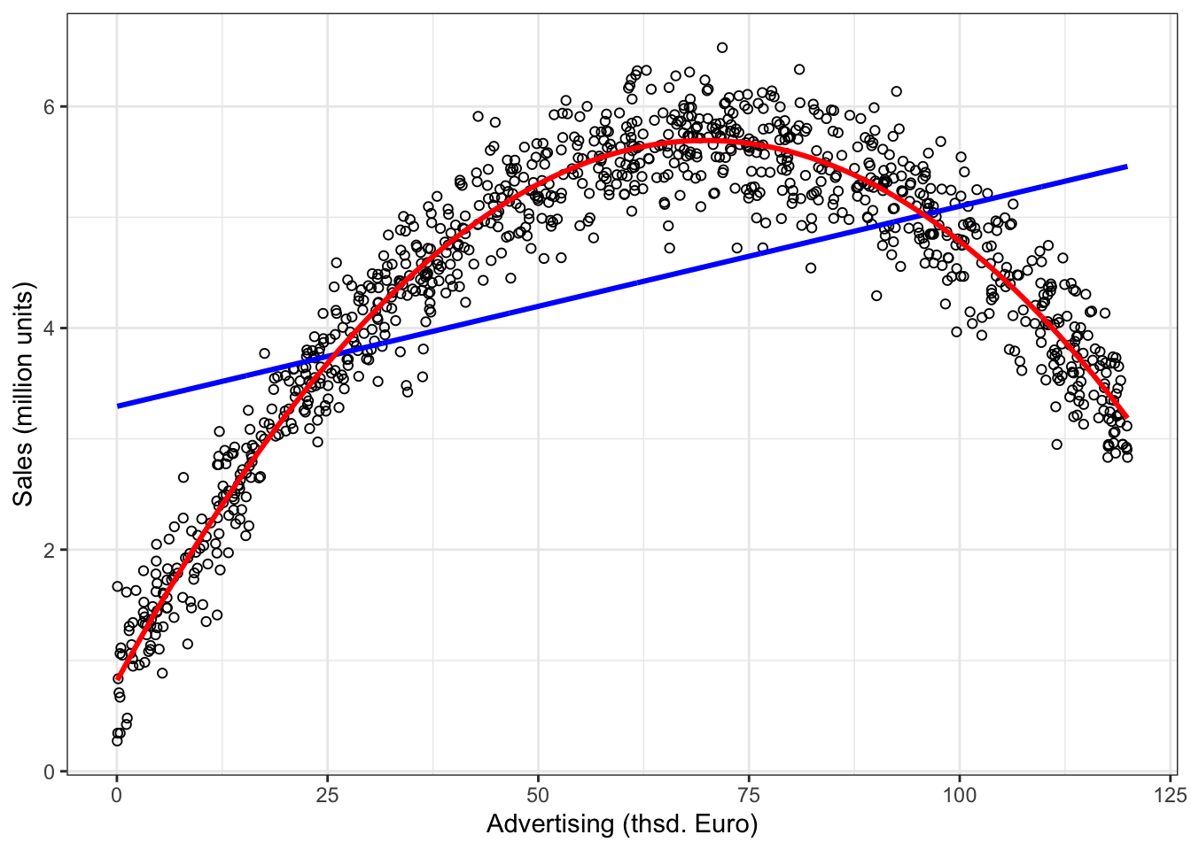 (LC7.3) What is the interpretation of the regression coefficient (\(\beta_1\)=0.05) in a regression model where log(sales) (i.e., log-transformed units) is the dependent variable and log(advertising) (i.e., the log-transformed advertising expenditures in Euro) is the independent variable (i.e., \(log(sales)=13.4+0.05∗log(advertising)\))?
