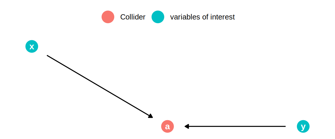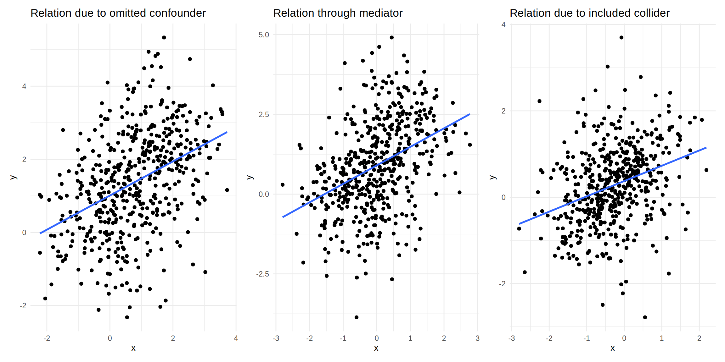 - Mediators \(\Rightarrow\) mediation analysis or omit from model (if we are only interested in the total effect)