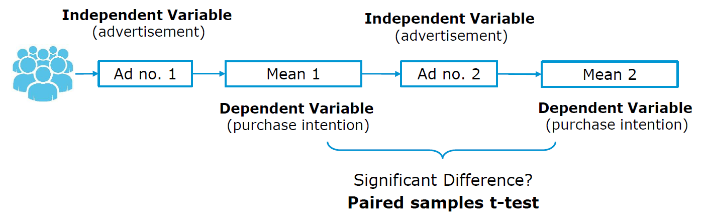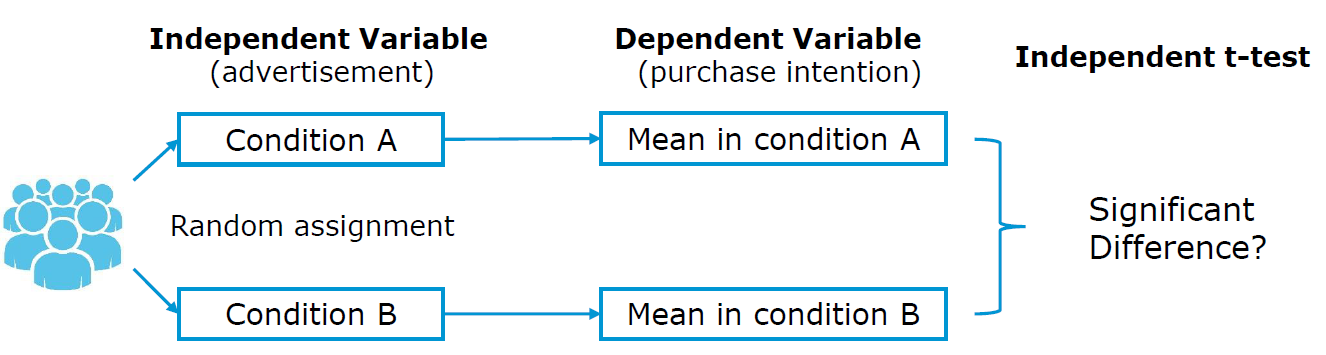 Consider the example of a survey analyzing the effect of different versions of an advertisement on purchase intention. Thus, one group of (randomly assigned) respondents will be exposed to one advertisement version while the other group (of randomly assigned respondents) will be exposed to another version. After that, both groups of respondents should express their intention to purchase the advertised product as shown in the following figure: