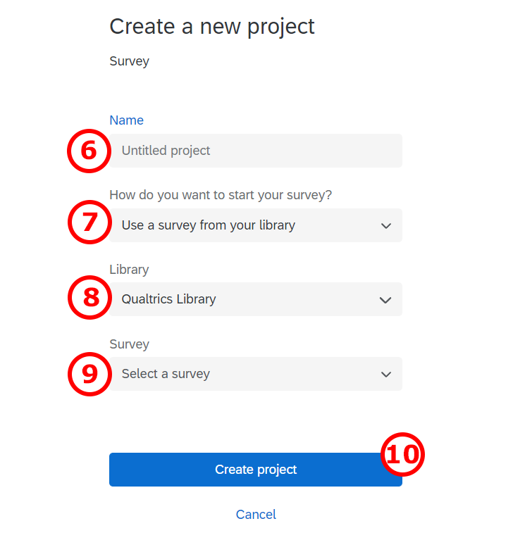 7./8./9. If you would like to import the example questionnaire, I provide above, you may do so using the “import from QSF file” option. If you would like to create a new questionnaire on the basis of an already existing one, then you choose “Copy a survey from an existing project” (you most likely will not need this option). If there is a questionnaire in the Qualtrics Library you would like to use, then you need to choose “From Library”, and indicate one library name in the dropdown menu (you most likely will not need this option). If you use the library or copy option, then you need to indicate the questionnaire you would like to copy. Now you are good to go! 10. Create your project