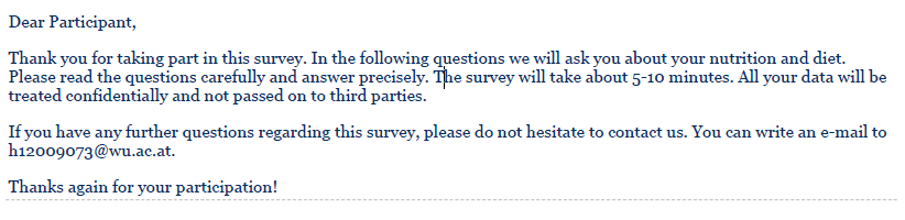 The sequence of questions in a questionnaire plays an important role. Your questionnaire will usually start with an introductory page with a call-to-action to fill out the survey and a brief statement regarding the details about the survey (e.g., topic, duration). Note that you should carefully consider how much information you would like to disclose about the goal of the survey. If respondents are aware of the goal of the survey, they might strategically answer to influence the results. Nowadays, with the increasing sensitivity of respondents to privacy issues, it is also common practice to provide information about the usage of the data and if the responses are anonymous or not. If the questionnaire asks the respondents for personal information (e.g., an email address) you may also need a privacy statement. For transparency it is also recommended to provide an email-address that respondents may use in case of questions regarding the survey.