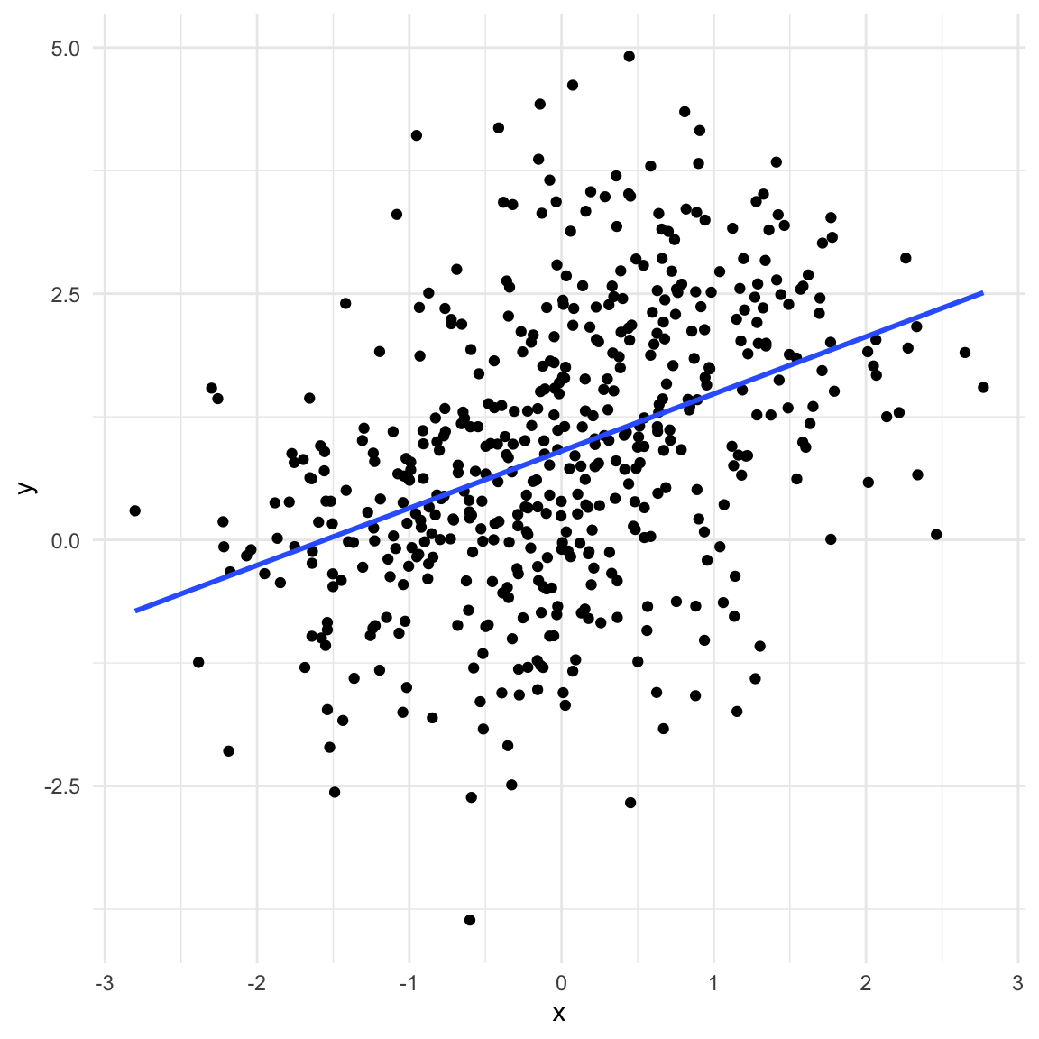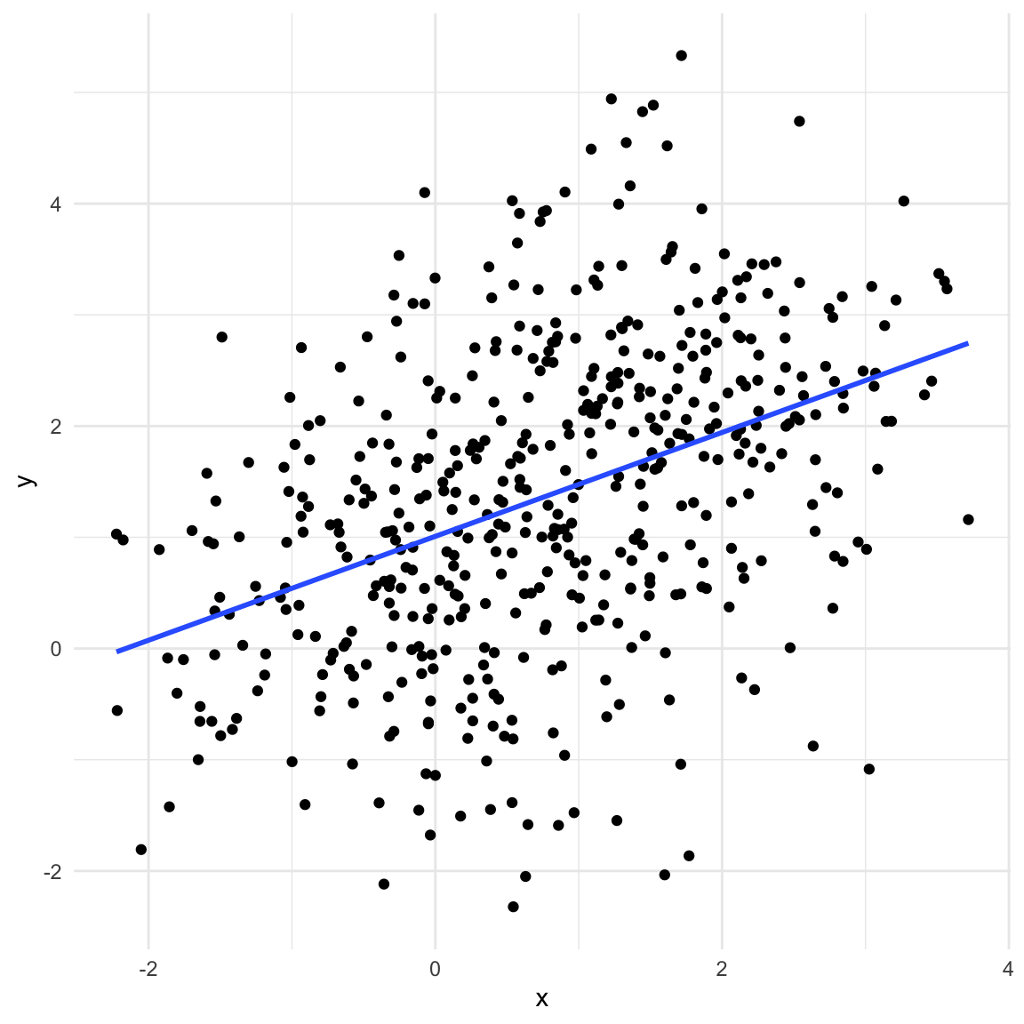 set.seed(11)# n ... number of observationsn <-500# d ... binary confounderd <-rbinom(n, 1, 0.5)x <-1.5* d +rnorm(n)y <-0.4+2* d +rnorm(n)data_fork <-data.frame(x, y, d =factor(d, levels =c(0, 1), labels =c("Yes", "No")))ggplot(data_fork, aes(x, y)) +geom_point() +geom_smooth(method ="lm", se =FALSE) +theme_minimal()