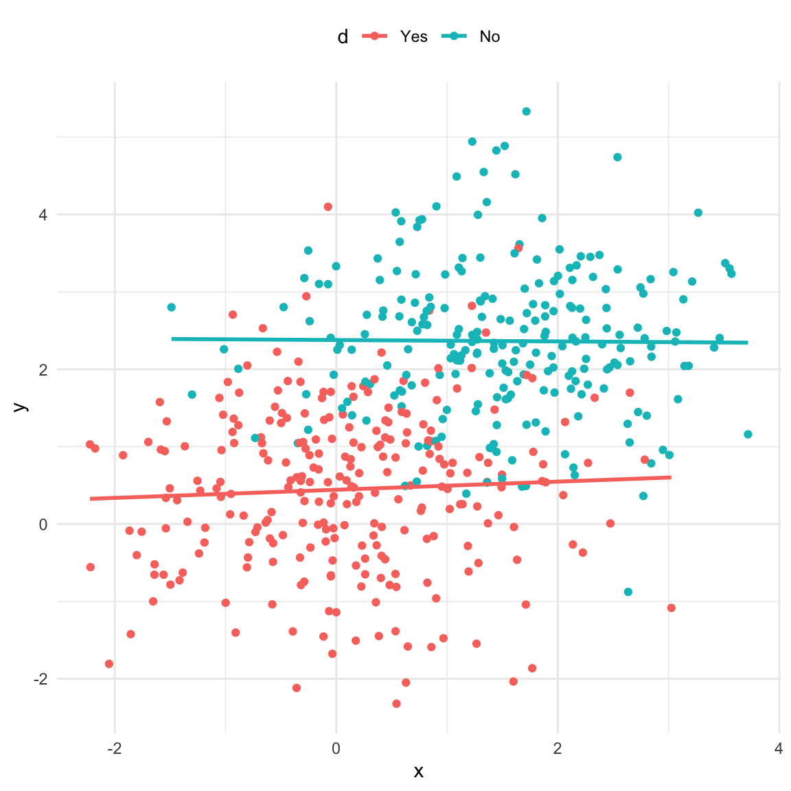 # options(scipen = 10)ggplot(data_fork, aes(x, y, color = d)) +geom_point() +geom_smooth(method ="lm", se =FALSE) +theme_minimal() +theme(legend.position ="top")