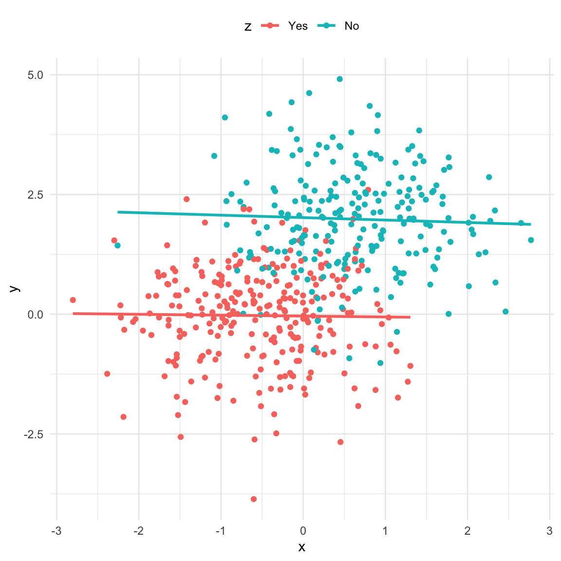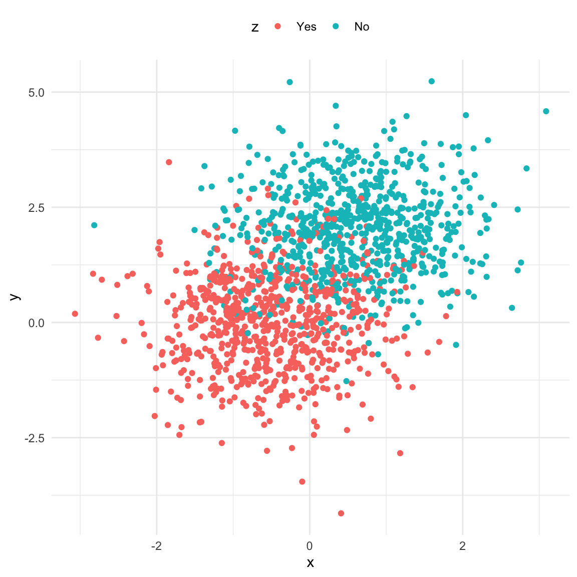 ## z is caused by Xz <-rbinom(n, 1, boot::inv.logit(2* x +rnorm(n)))## y is caused by zy <-2* z +rnorm(n)pipe <-data.frame(x, y, z =factor(z,levels =c(0, 1),labels =c("Yes", "No")))ggplot(pipe, aes(x, y, color = z)) +geom_point() +theme_minimal() +theme(legend.position ="top")