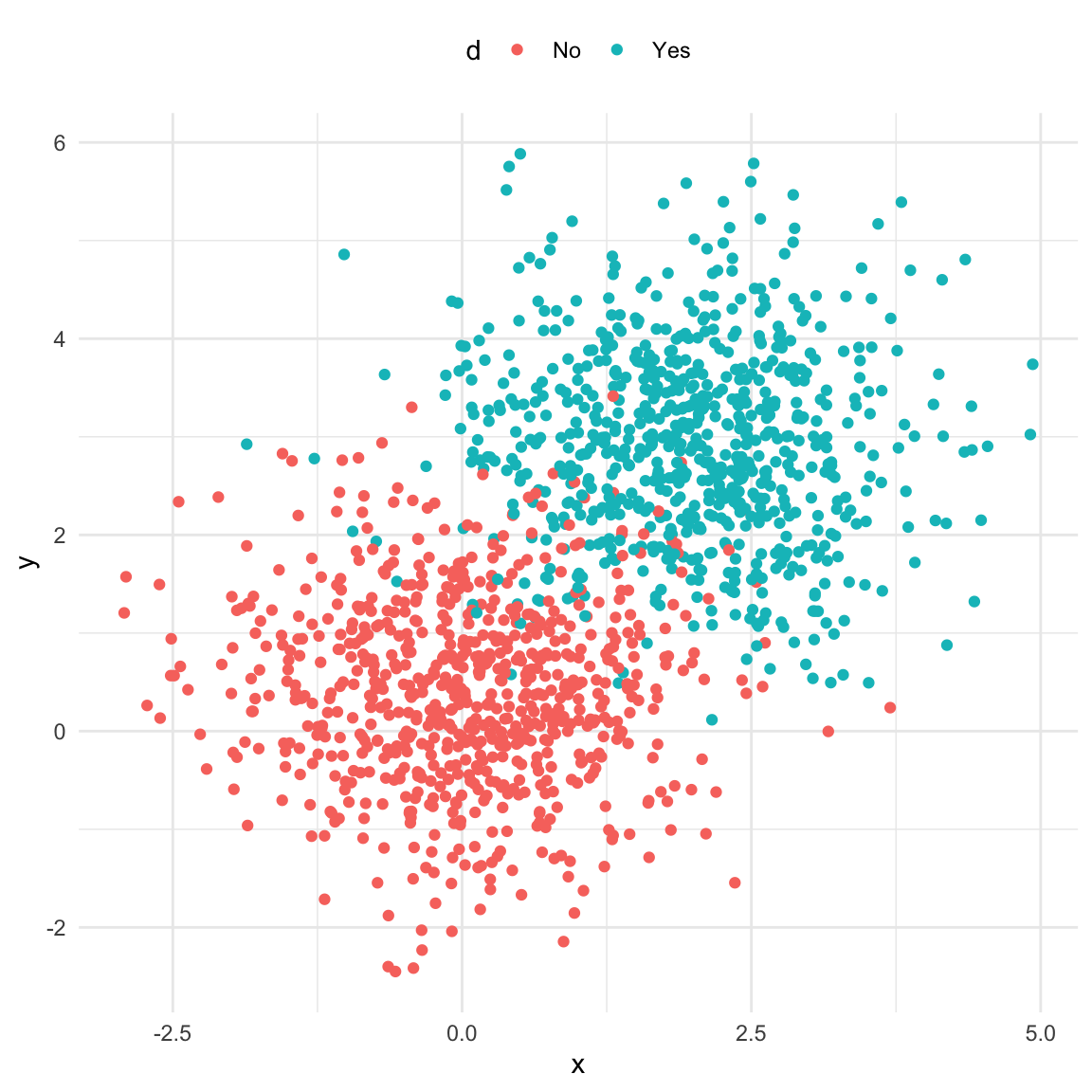 ## Make code reproducibleset.seed(11)## Number of observationsn <-1500## Random draw from Bernoulli with p(1) = 0.5, p(0) = 0.5d <-rbinom(n, 1, 0.5)## X is caused by dx <-2* d +rnorm(n)## y is caused by dy <-0.4+2.5* d +rnorm(n)fork <-data.frame(x, y, d =factor(d,levels =c(0, 1),labels =c("No", "Yes")))ggplot(fork, aes(x, y, color = d)) +geom_point() +theme_minimal() +theme(legend.position ="top")