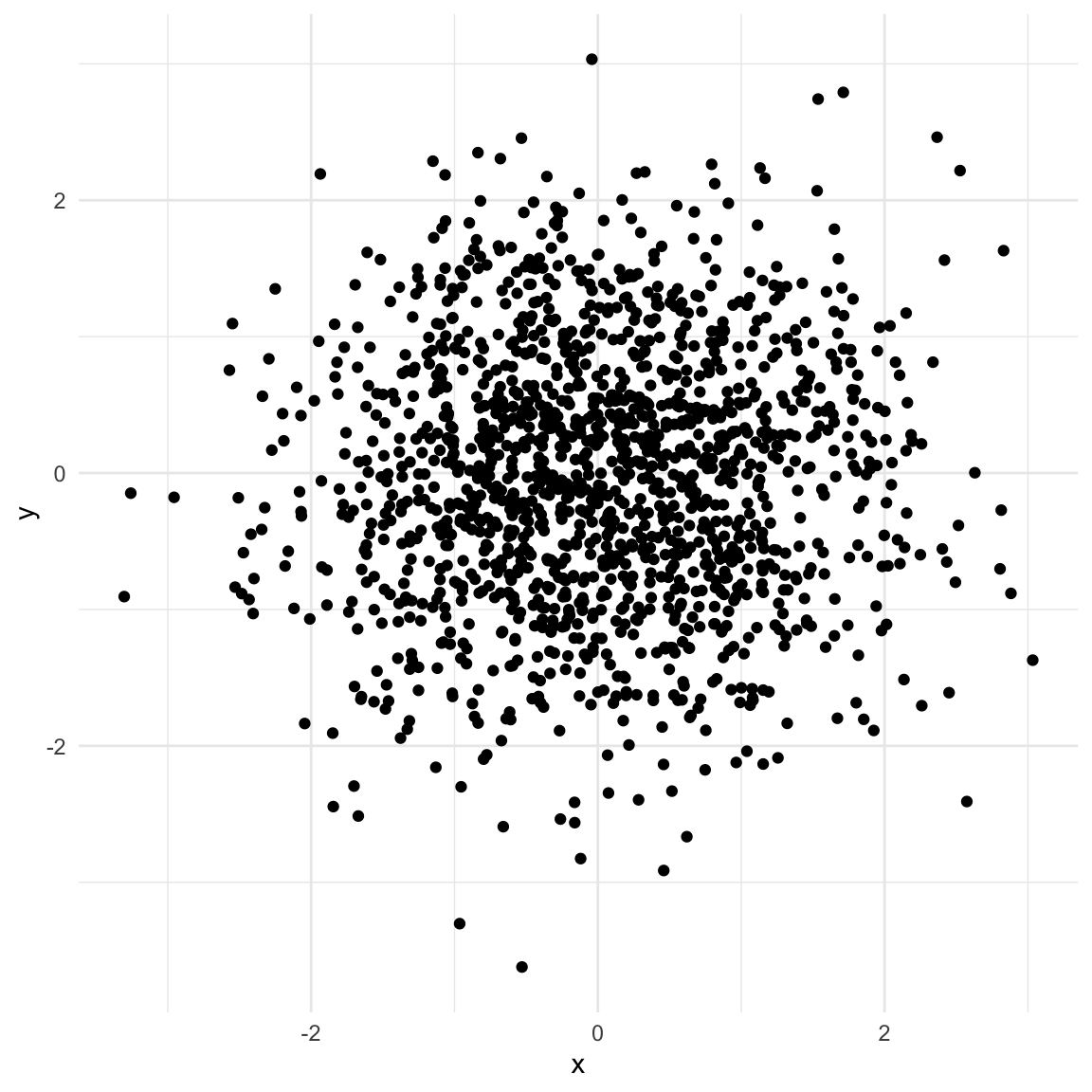 ## Generate random xx <-rnorm(n)## Generate random yy <-rnorm(n)## a is caused by both X and ya <-rbinom(n, 1, boot::inv.logit(9* x -9* y +rnorm(n)))collider <-data.frame(x, y, a =factor(a,levels =c(0, 1),labels =c("No", "Yes")))ggplot(collider, aes(x, y)) +geom_point() +theme_minimal()