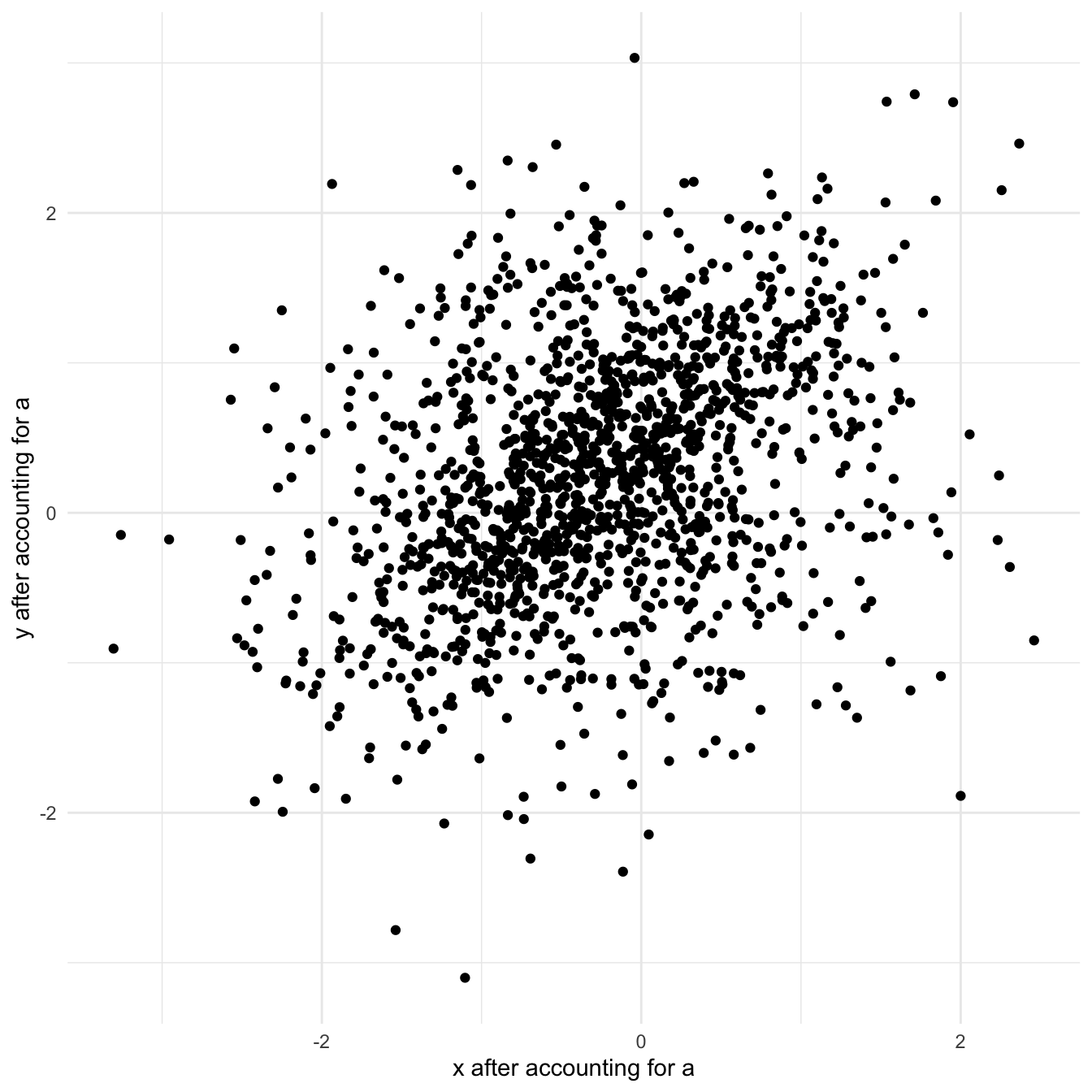 collider$x_a <-residuals(lm(x ~0+ a))collider$y_a <-residuals(lm(y ~0+ a))ggplot(collider, aes(x_a, y_a)) +geom_point() +theme_minimal() +labs(x ="x after accounting for a", y ="y after accounting for a")
