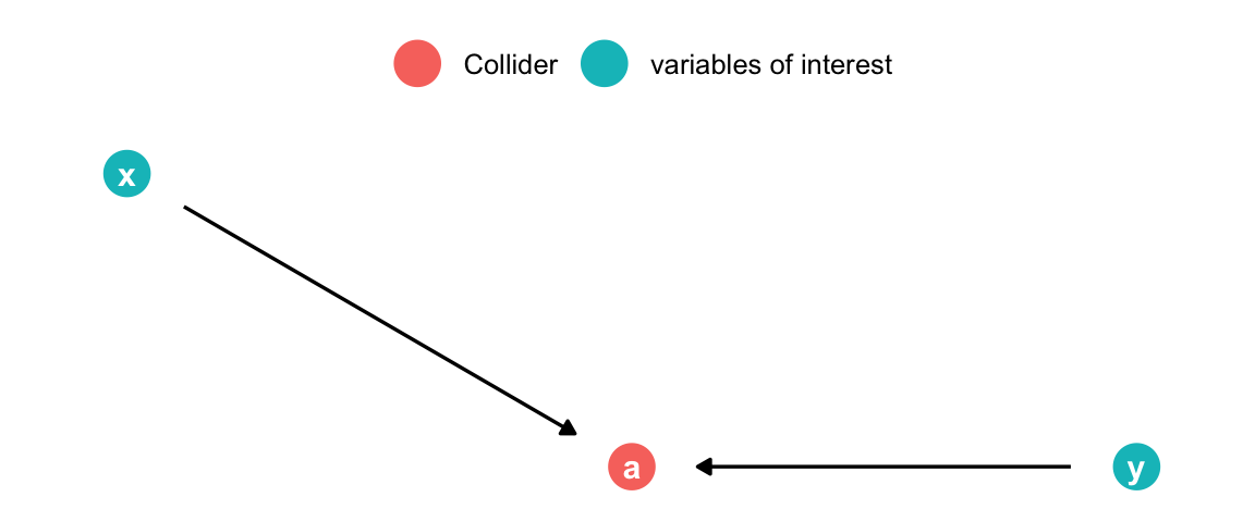 dagify(a ~ x, a ~ y,coords =list(x =c(x =1, y =2, a =1.5), y =c(x =1, y =0, a =0))) |>tidy_dagitty() |>mutate(fill =ifelse(name =="a", "Collider", "variables of interest")) |>ggplot(aes(x = x, y = y, xend = xend, yend = yend)) +geom_dag_point(size =7, aes(color = fill)) +geom_dag_edges(show.legend =FALSE) +geom_dag_text() +theme_dag() +theme(legend.title =element_blank(),legend.position ="top" )