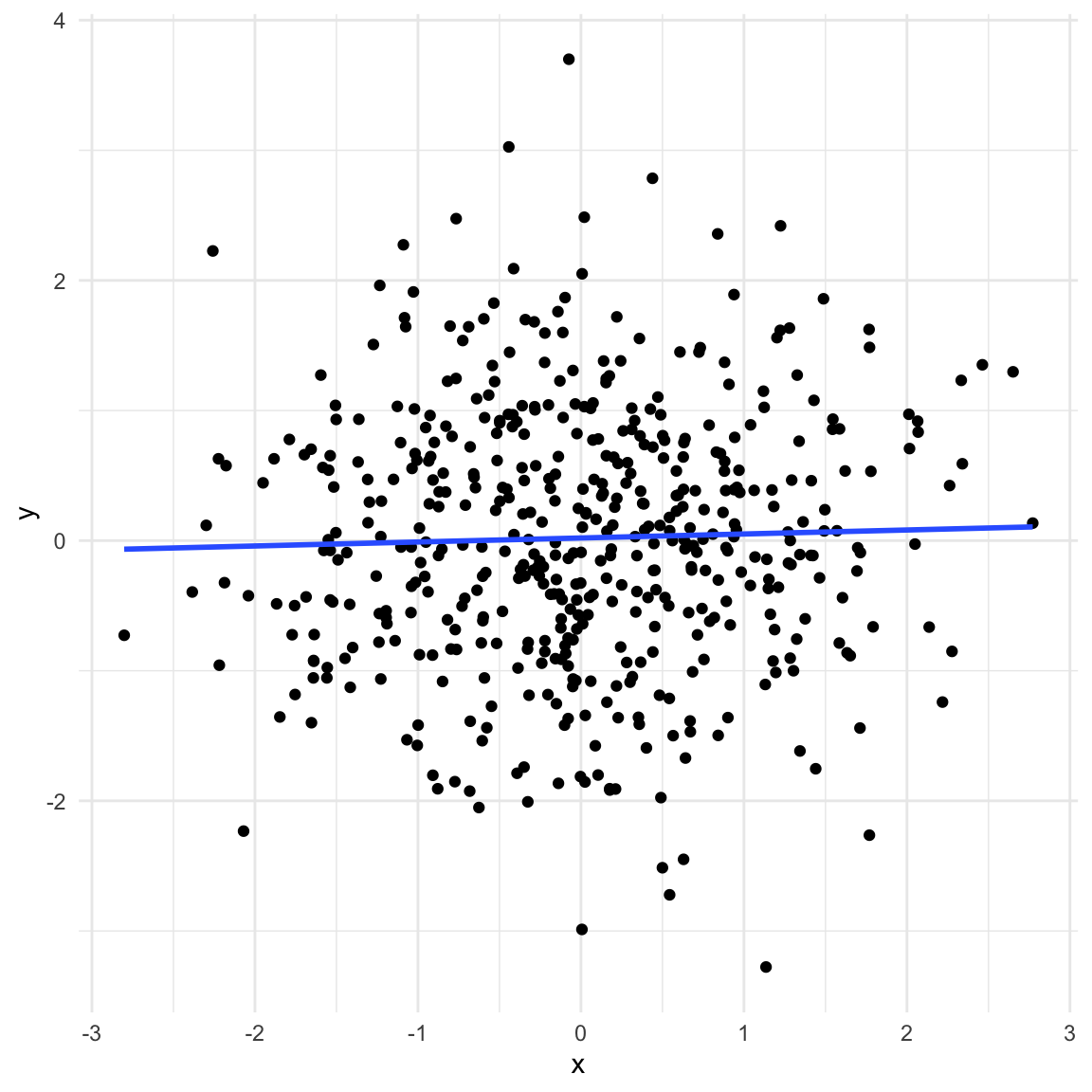 set.seed(11)x <-rnorm(n)y <-rnorm(n)a <-rbinom(n, 1, boot::inv.logit(9* x -9* y +rnorm(n)))data_collider <-data.frame(x, y, a =factor(a, levels =c(0, 1), labels =c("No", "Yes")))ggplot(data_collider, aes(x, y)) +geom_point() +geom_smooth(method ="lm", se =FALSE) +theme_minimal()