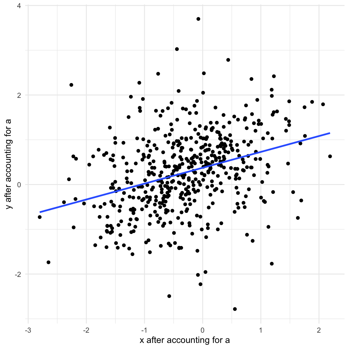 In order to get the partial correlation of \(X\) and \(y\) after accounting for \(a\) we first regress both \(X\) and \(y\) on \(a\) and use the unexplained part (residual) in the plot. This is equivalent to a regression that has both \(X\) and \(a\) as explanatory variables.
