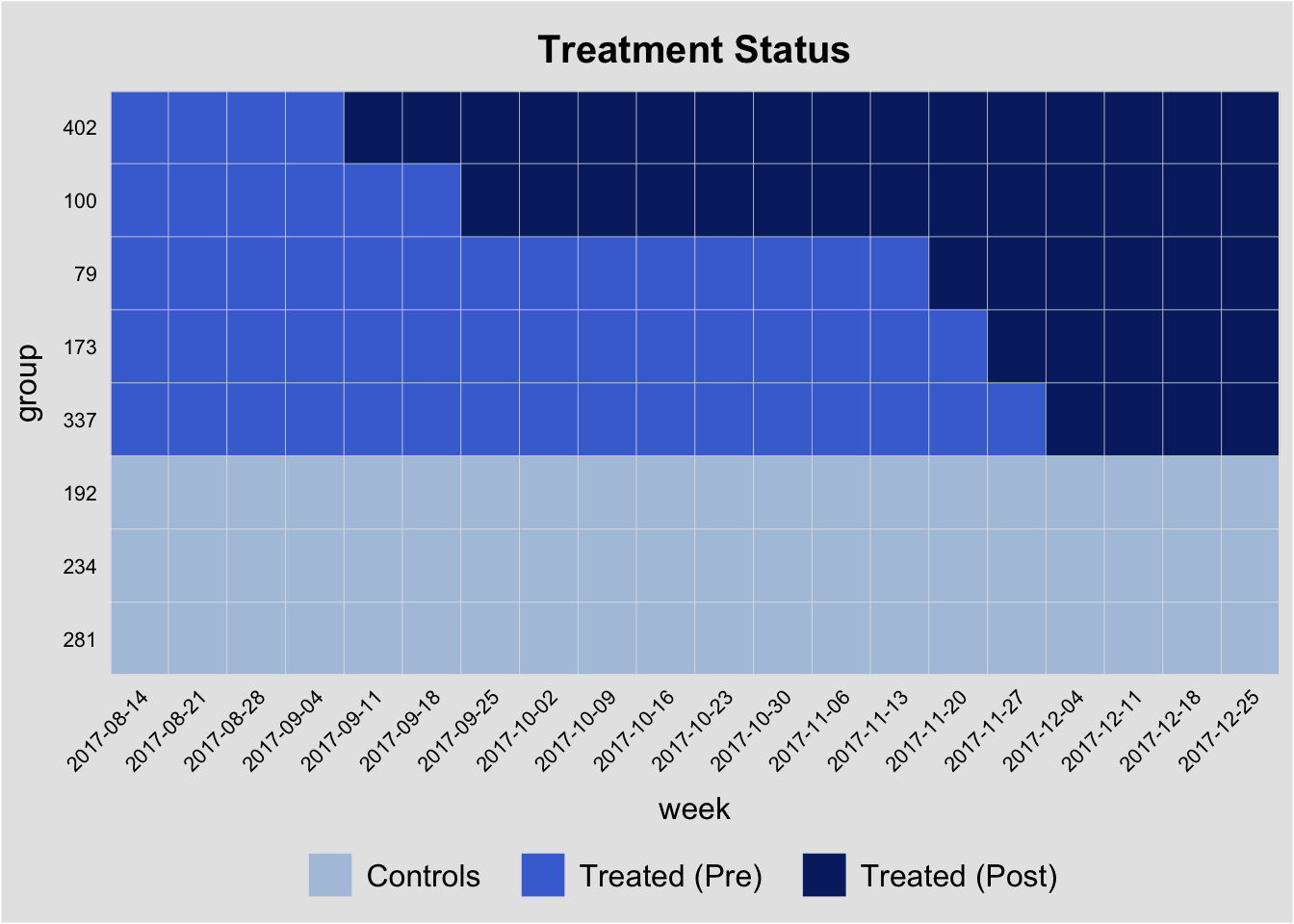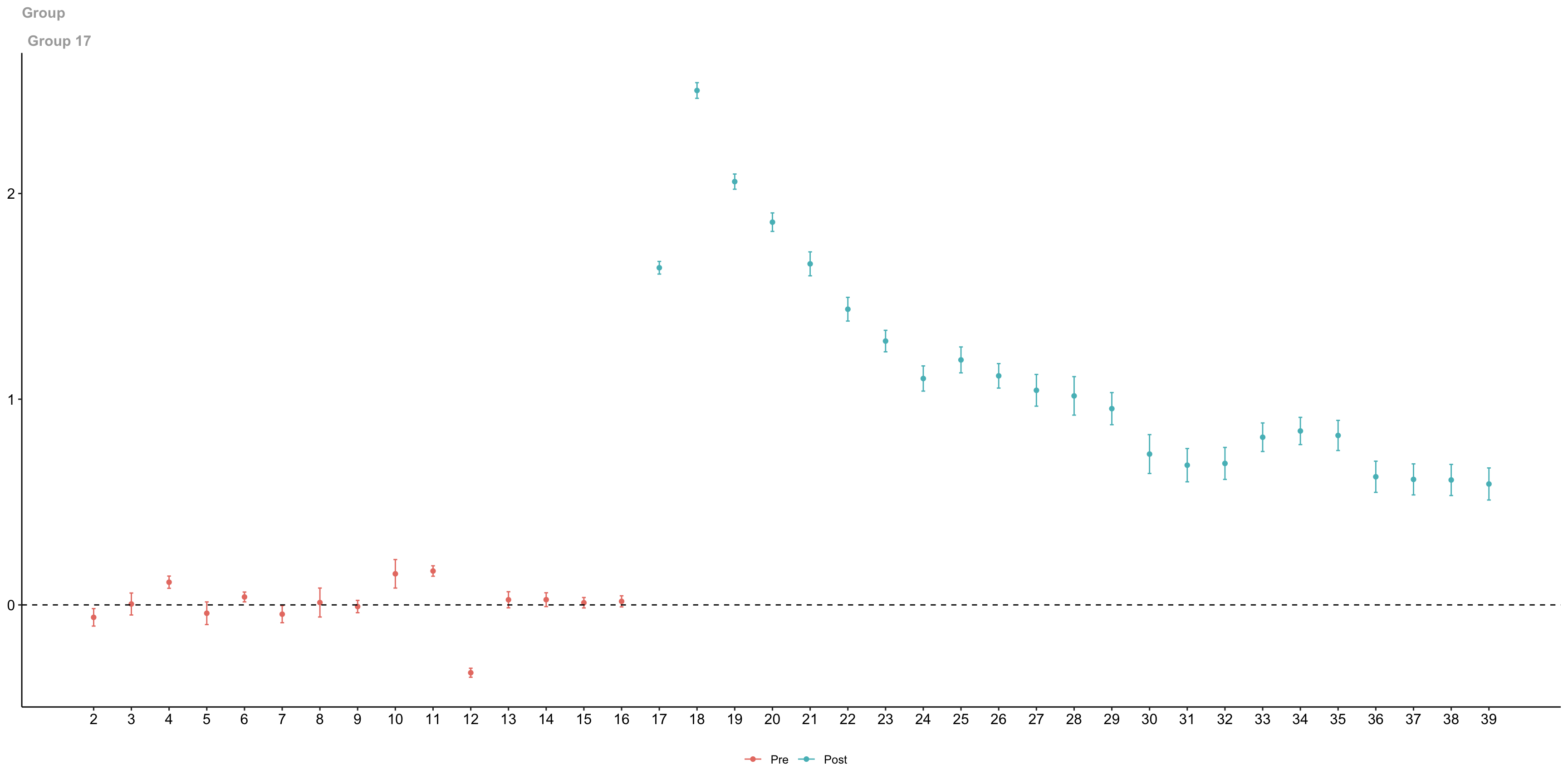 did_data_staggered$log_streams <-log(did_data_staggered$streams+1)# add first period treateddid_data_staggered_G <- did_data_staggered |>filter(treated ==1, week == treat_week) |>select(song_id, G = week_num)did_data_staggered <-left_join(did_data_staggered, did_data_staggered_G,by ="song_id")did_data_staggered$G <-coalesce(did_data_staggered$G, 0)did_data_staggered$id <-as.numeric(did_data_staggered$song_id)set.seed(123)#increase bootstrap for reliability!library(did)mod.csa <-att_gt(yname ="log_streams",tname ="week_num",idname ="id",gname ="G",biters =2000,data = did_data_staggered)