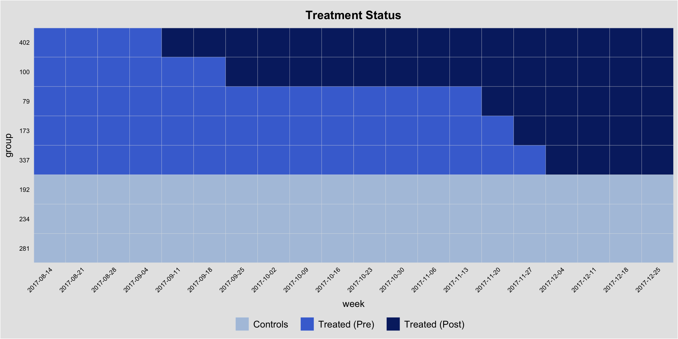 Existing methods for multiple time periods (e.g., Callaway and Sant’Anna 2021) work well if the number of treated units in each group \(g\) is “large” (>5)