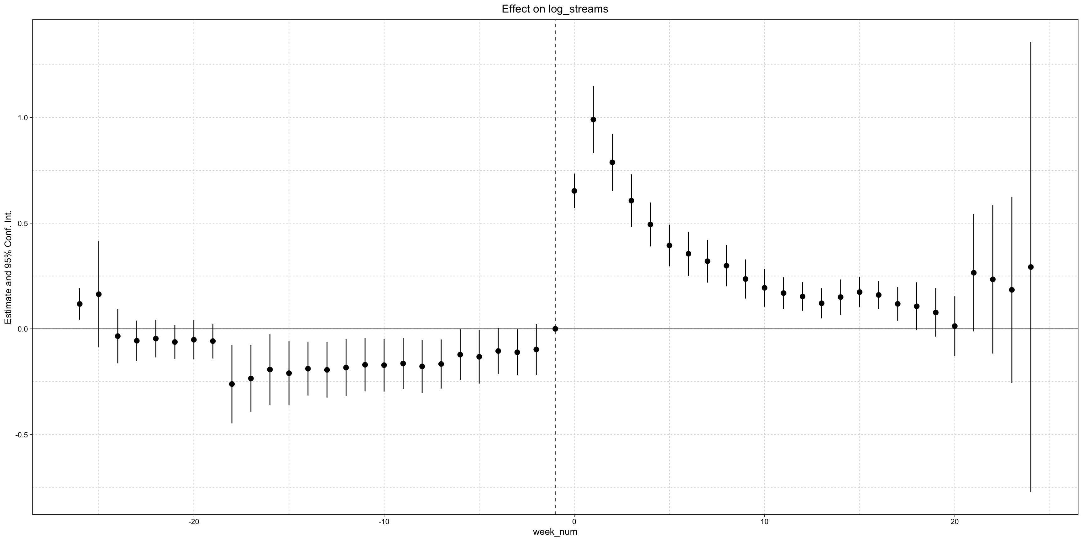 library(ggiplot)mod.sunab <-feols(log_streams ~sunab(G, week_num) | id + week_num, data = did_data_staggered )ggiplot(mod.sunab)